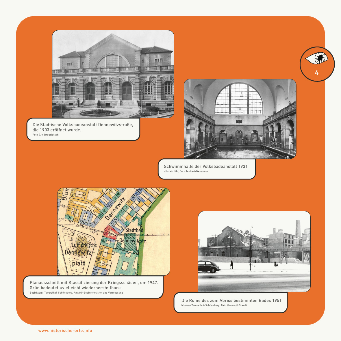 Meerjungfrauen und Fische schmücken die Fassade dieses ungewöhnlichen Gebäudes. Sie verweisen auf seine ursprüngliche Besonderheit: das schmale Wohnhaus von 1899 bildete den Zugang zur städtischen Badeanstalt, die auf dem Hintergelände lag und von der einst durchgehend bebauten Dennewitzstraße aus nicht zu sehen war.