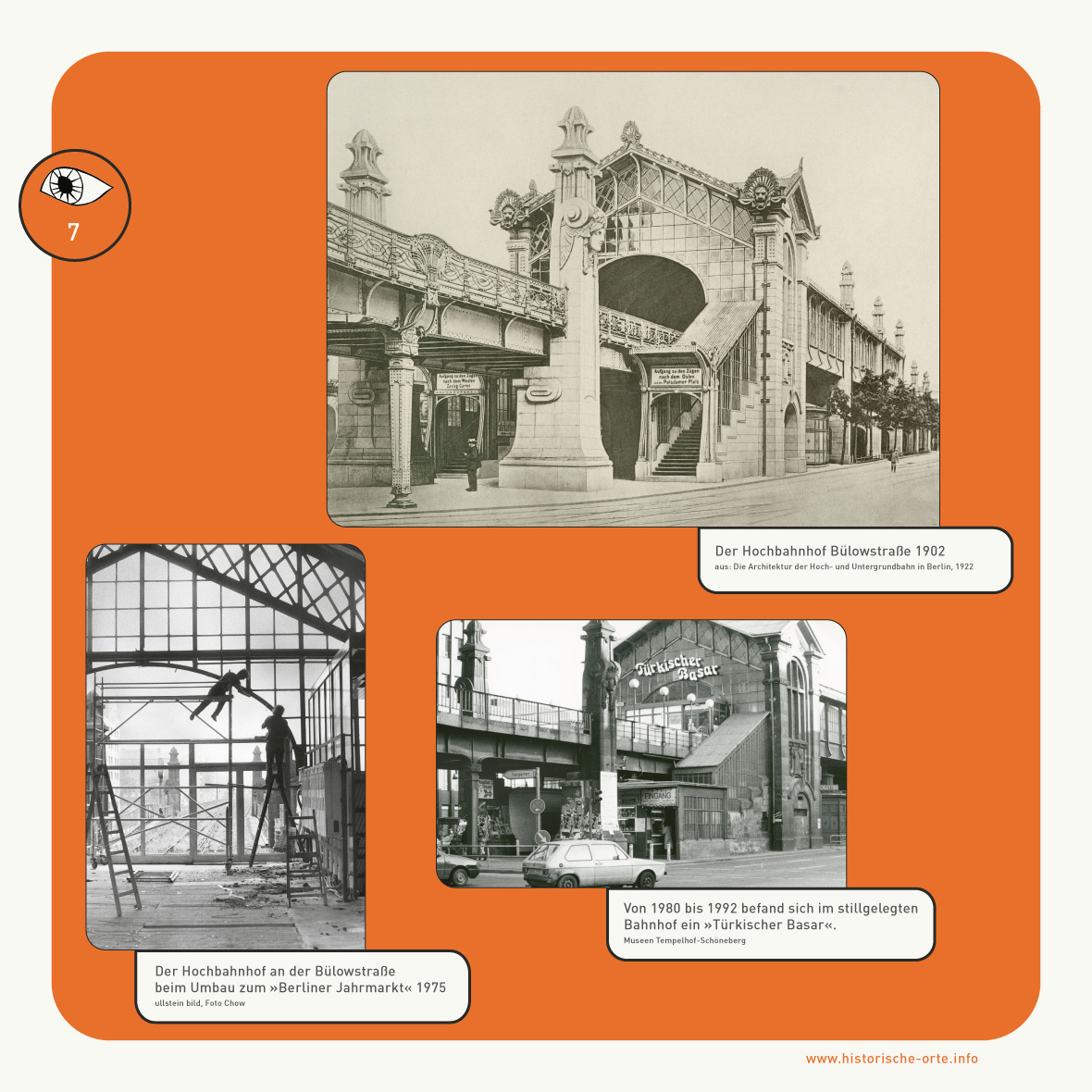 Der Bahnhof Bülowstraße liegt an der ältesten Strecke der Berliner Hoch- und Untergrundbahn. Als die Linie 1902 eröffnet wurde, war die Bülowstraße ein Prachtboulevard. Beim Bau der Hochbahn hatte die wohlhabende Bevölkerung ihren Einfluss geltend gemacht und eine repräsentative Gestaltung von Bahnhof und Viadukt gefordert.