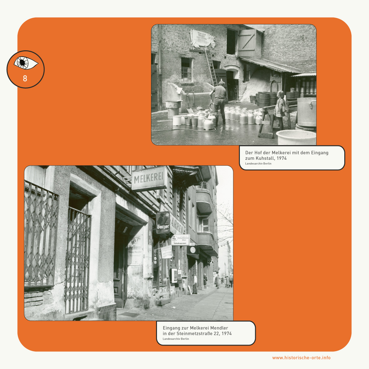 Im Hinterhof dieses Hauses standen einst Milchkühe und Zuchtbullen. Sie gehörten der Familie Mendler, die seit 1931 hier eine Melkerei betrieb. Eine Remise im Hof diente als Verkaufsstelle und die Kühe waren in einem Stall im zweiten Hof untergebracht. Hühner, Kaninchen und ein Schweinestall im Souterrain komplettierten den städtischen Bauernhof.